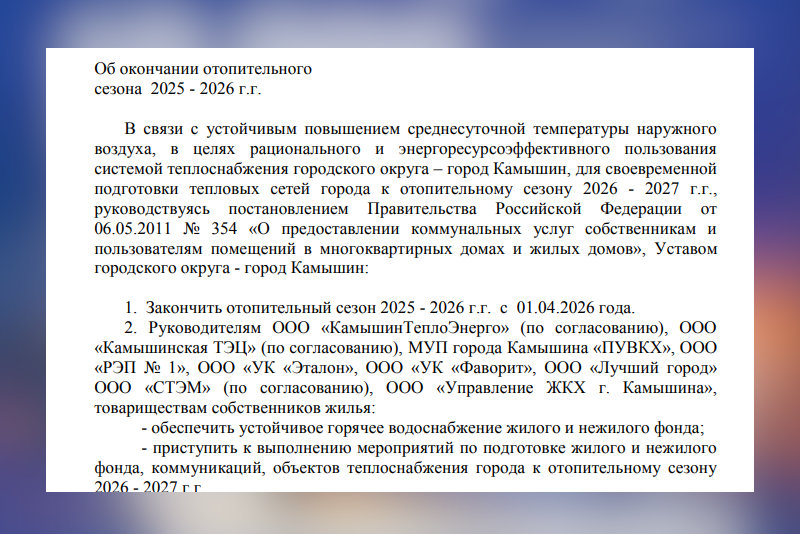 Сегодня, 1 апреля 2026 года, в Камышине официально завершён отопительный сезон. Об этом проинформировала пресс-служба администрации города, сославшись на распоряжение главы Камышина С.В. Зинченко. Согласно документу, отопительный сезон окончен «в связи с устойчивым повышением среднесуточной температуры наружного воздуха до +8°С».