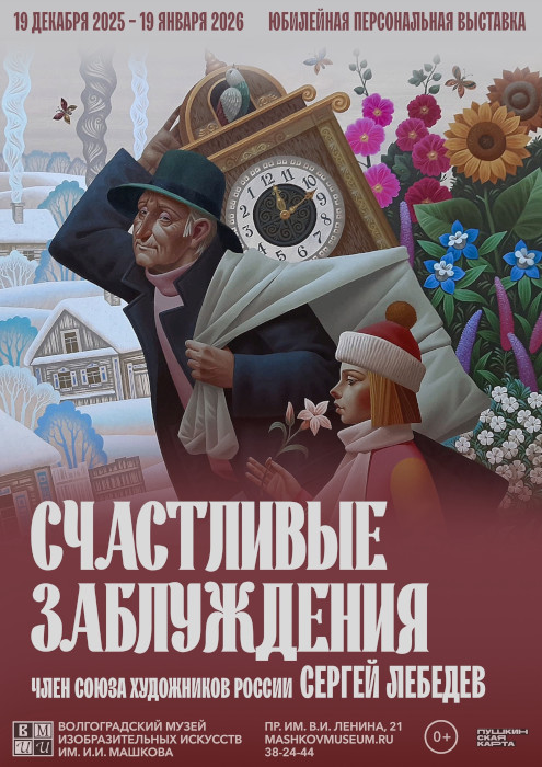 С 19 декабря 2025 года по 19 января 2026 года в Волгоградском музее изобразительных искусств имени Машкова состоится юбилейная персональная выставка члена Союза художников России Сергея Лебедева. 60 работ собраны под единым названием «Счастливые заблуждения».
