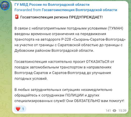 Госавтоинспекция настоятельно просит отказаться от поездок автомобильным транспортом в направлениях Волгоград-Саратов и Саратов-Волгоград до улучшения погодных условий.
