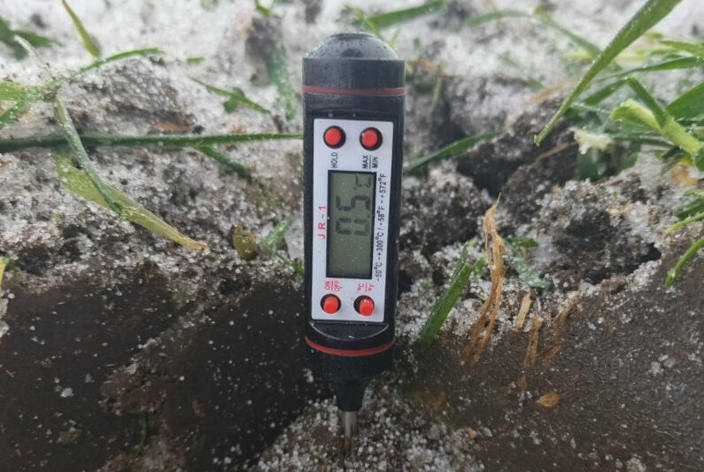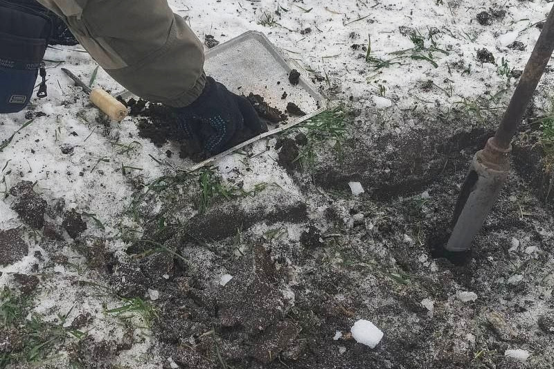Уточняется, что работы проходили в ветреную погоду при температуре воздуха 2,1°С. Температура почвы на уровне залегания узла кущения составила +0,5°С, что обусловлено наличием снежного покрова высотой 7-10 см. Снег имеет рыхлое строение. Отмечено также незначительное наличие ледяной корки рыхлой консистенции, толщина которой на момент наблюдения не превышает 1 см. Глубина промерзания почвы на момент обследования составила 6 см.
