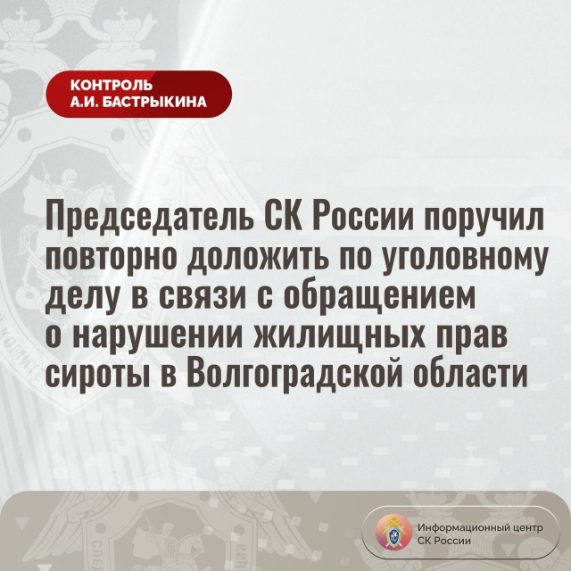 Председатель Следственного комитета России Александр Бастрыкин поручил повторно доложить ему о ходе расследования по уголовному делу о нарушении жилищных прав сироты в Волгоградской области.