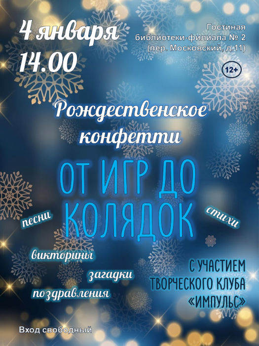 Ждём вас 4 января в 14:00 в гостиной библиотеки-филиала № 2 (пер. Московский, д.11). Вход свободный.