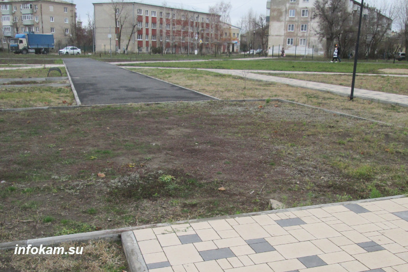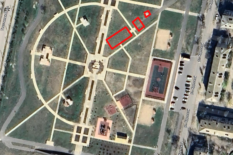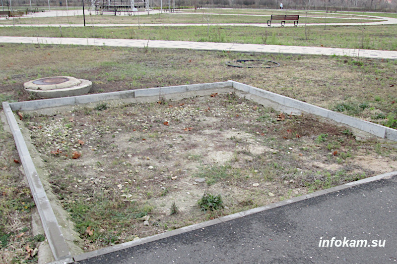 Возник и ещё один важный вопрос: что за три «площадки» остались лишь «обозначенными»? Они ограничены бордюрным камнем, к ним подведены дорожки — асфальтированная и покрытая тротуарной плиткой. К одной даже подведено электричество — установлен электрощит. Но на самой территории лишь растёт трава. Хотя видно, что здесь что-то планировалось.