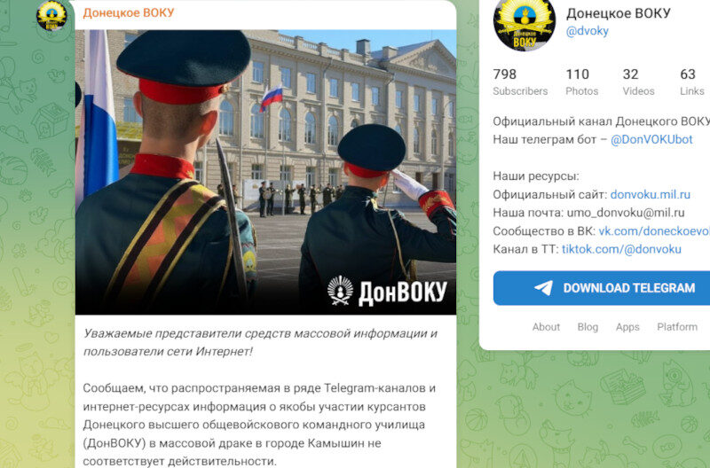 28 ноября пресс-центр ДонВОКУ в своём телеграмм-канале сообщил: «Распространяемая в ряде Telegram-каналов и интернет-ресурсах информация о якобы участии курсантов Донецкого высшего общевойскового командного училища (ДонВОКУ) в массовой драке в городе Камышине не соответствует действительности».