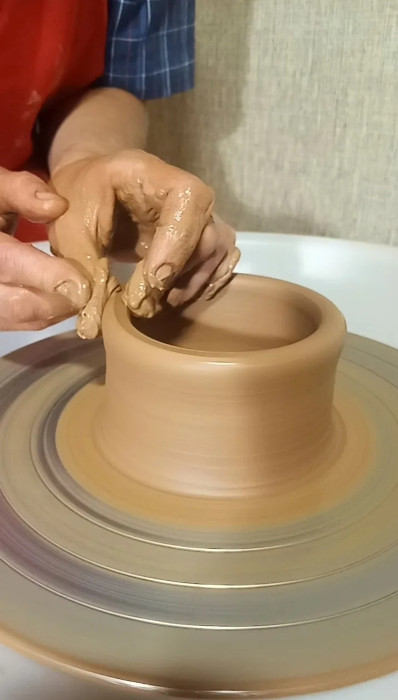 — На гончарном круге невозможно создать несимметричное изделие. Практика, практика и еще раз практика! Начинающим мастерам могу дать несколько советов. Во-первых, скорость вращения круга необходимо отрегулировать до 120 оборотов, что примерно в два раза медленнее максимальной скорости вращения. Во-вторых, подготовленная глина обязательно должна иметь оптимальную влажность и пластичность, быть разогретой (перебитой) руками. Сразу из упаковки комочек глины отцентровать можно, но не новичку, поскольку по ощущениям она будет застывшей, а центровать и тянуть стенки изделия будет сложно.