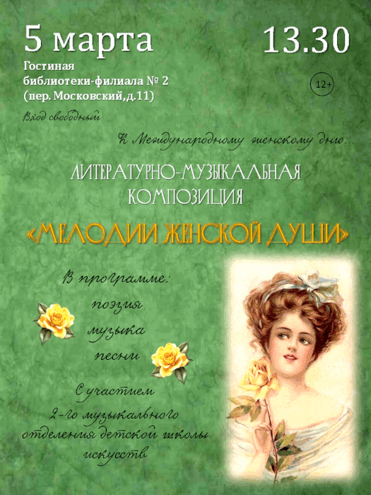 В преддверии Международного женского дня в библиотеке- филиале №2 состоится литературно-музыкальная композиция «Мелодии женской души».