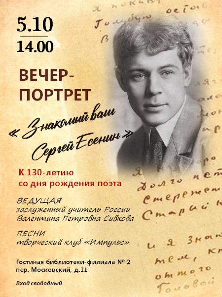 Вечер-портрет «Знакомый ваш Сергей Есенин» состоится 5 октября в 14:00 в гостиной библиотеки-филиала № 2 (пер. Московский, д.11). Вход свободный.