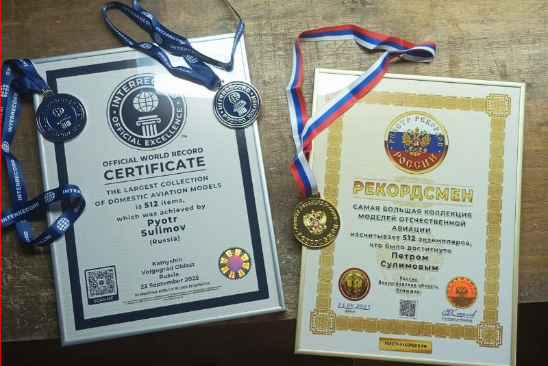 7 октября 2025 рекорд был зарегистрирован (ссылка на Книгу рекордов). А на днях Петру Сулимову был доставлен сертификат «Самая большая коллекция моделей отечественной авиации» и прилагающаяся медаль.
