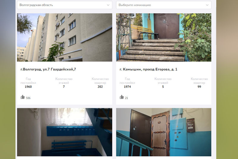 Всего от Волгоградской области подано 47 заявок. Есть в списке дома из Петрова Вала и Камышина. В частности, от Камышина представлены: ул. Циолковского, №9, ул. Пушкина, №142, проезд Феоктистова, №53, и проезд Егорова, №1. Что касается Петрова Вала, то это проспект Пионеров, №8, ул. 30 лет Победы, №6 и проспект Пионеров, №1.