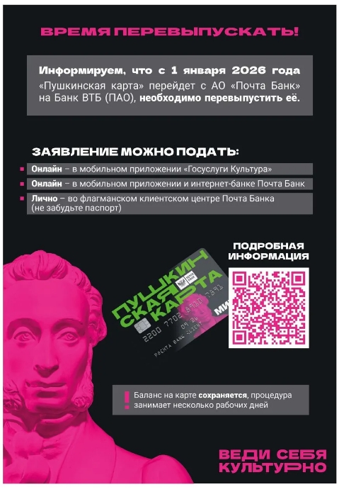 Подробная информация о сроках и порядке перевыпуска «Пушкинской карты» размещена по ссылке: clck.ru/3NEdUb