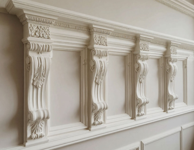 Декоративная отделка мебели из полиуретана. Это специальные накладки, которыми украшают дверцы шкафов и ящики комодов. Декор выполняется в виде красивых завитков, обычно парами. Накладка преимущественно белого или молочно-белого цвета, но также доступны бронзовые или медные тона.