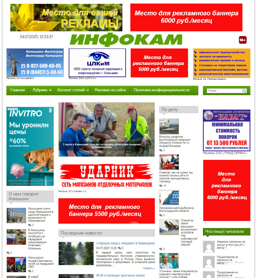Интернет-портал infokam.su читают как в Камышине, так и в селах Камышинского района, городах Петровом Вале, Котово. Плюс Николаевск за Волгой, Ольховский и другие близлежащие районы, новости о которых выходят на нашем сайте.