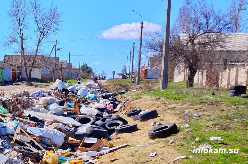 Итог: типичная свалка в Камышине на улице Пролетарской по состоянию на 6 апреля 2026 года. Контейнеры регулярно очищаются. Основная часть отходов на свалке — ветки, листва в мешках, части мебели и… автопокрышки.