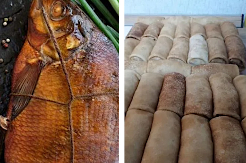 Рыба обосновалась на седьмом месте. За 350 рублей можно прибрести леща горячего копчения. За 700 рублей продаётся вяленая рыба: жерех, тарань, лещ, кутум). 250 рублей просят за свежую рыбу (судак 350 рублей).