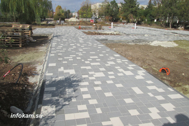 На этой территории производится укладка тротуарной плитки на пешеходные дорожки, облагораживаются грунтовые участки для посадки новых деревьев и кустарников. Отметим, что зелёная часть была практически сохранена, то есть зона отдыха будет по большей части озеленена за счёт высаженной здесь несколько десятилетий назад древесно-кустарниковой растительности. Также была заменена тротуарная плитка на части самой площади Павших борцов — с помощью разных цветов создан геометрический орнамент