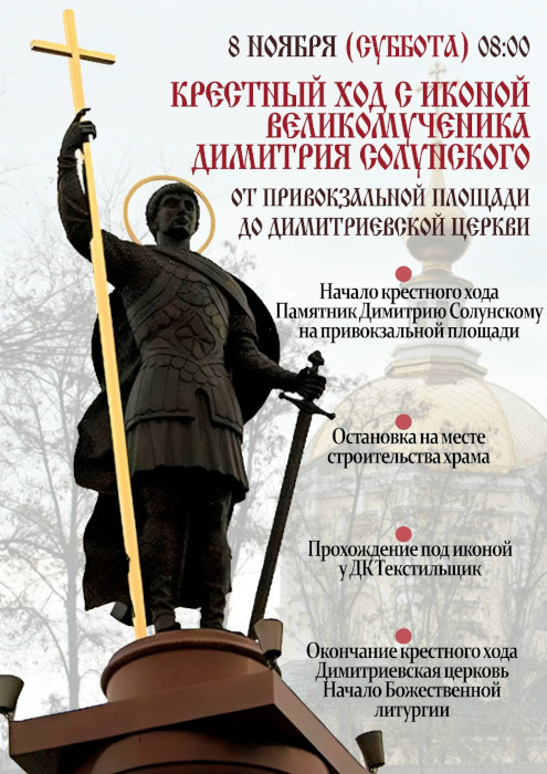 8 ноября православная церковь отмечает память Святого великомученника Димитрия Солунского. В Камышине в этот субботний день состоится Крестный ход с иконой святого Димитрия.