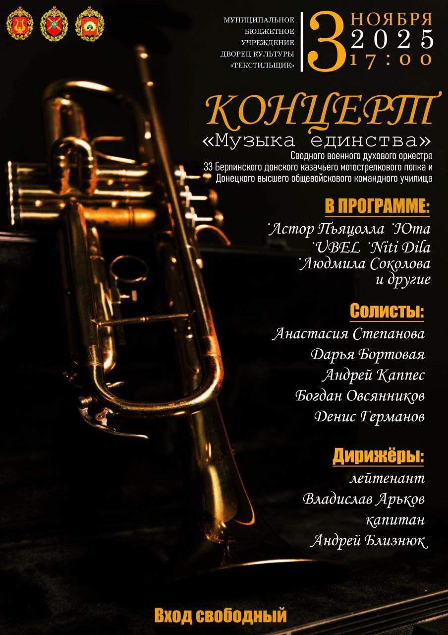 3 ноября жители Камышина и гости города могут посетить концерт «Музыка единства». На сцене Дворца культуры «Текстильщик» выступит сводный военный духовой оркестр 33-го Берлинского донского казачьего мотострелкового полка и Донецкого высшего общевойскового командного училища.