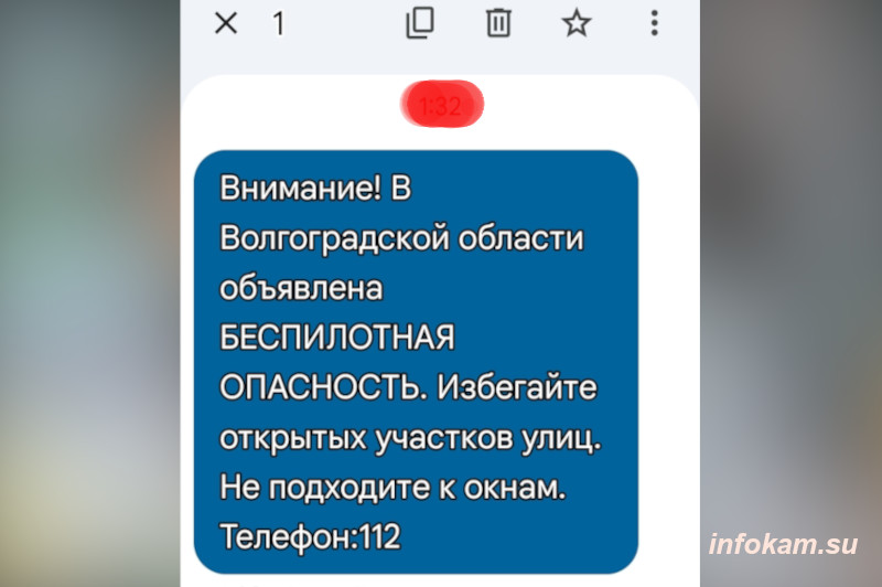 «Внимание! В Волгоградской области объявлена БЕСПИЛОТНАЯ ОПАСНОСТЬ. Избегайте открытых участков улиц. Не подходите к окнам. Телефон:112».