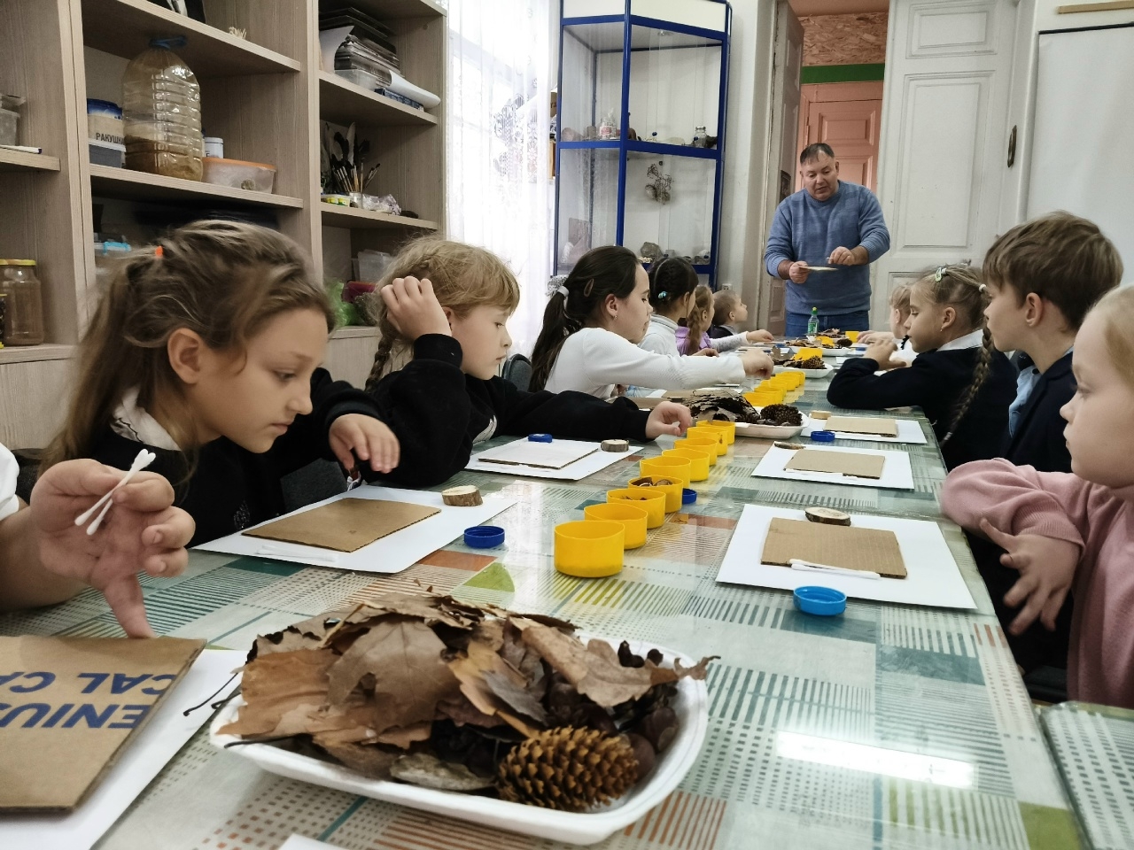 Старший научный сотрудник историко-краеведческого музея Николай Валерьевич Савеко пригласил ребят на мастер-класс. Юные гости с любопытством, присущим подрастающему поколению, и горящими глазами под руководством художника мастерили удивительные работы из природного материала. Каштаны, еловые шишки, песок, ракушки, кора деревьев, камешки, листья – в процессе кропотливой работы дети использовали все предложенные материалы, удивляясь тому, что из даров природы можно создать уникальные изделия. «Это же всё лежит у нас под ногами! Из этого можно делать предметы искусства?», - горячо спорили между собой ребята, не отвлекаясь от творчества. В конце занятия у каждого ребенка получилась особенная работа, которая станет украшением комнаты или классного кабинета.