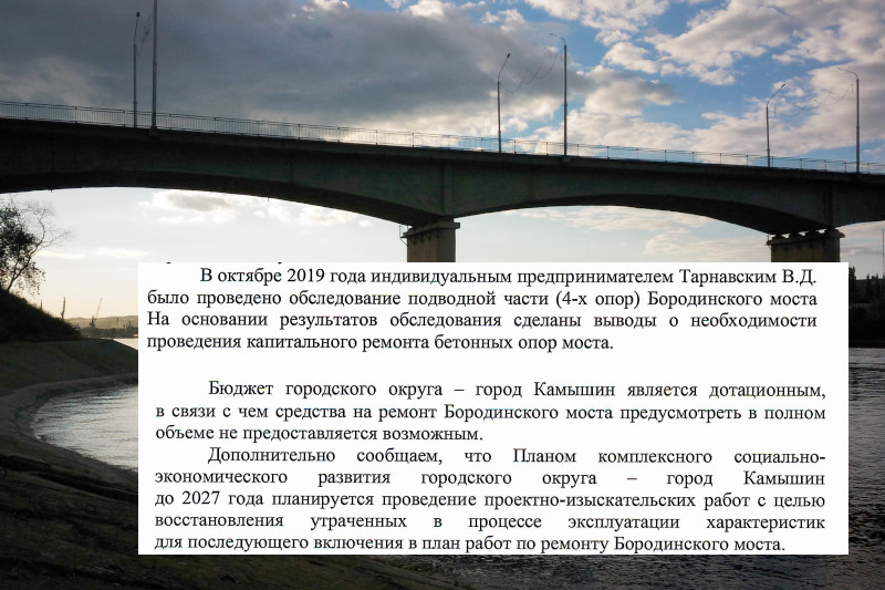 Далее в ответе уточнятся: «Бюджет городского округа — город Камышин является дотационным, в связи с чем средства на ремонт Бородинского моста предусмотреть в полном объеме не предоставляется возможным».
